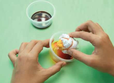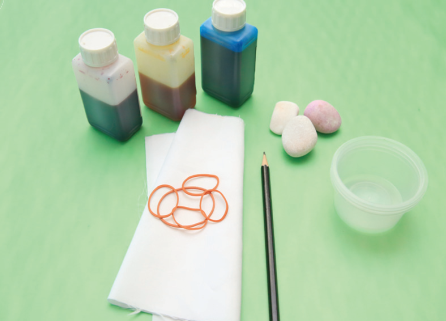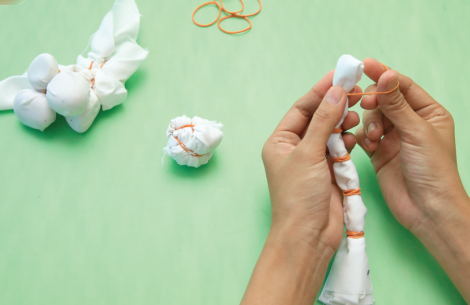 Yang keempat celupkan kain yang diikat ke dalam pewarna. Ulangi langkah ini dengan celup ke dalam warna yang berbeza.
