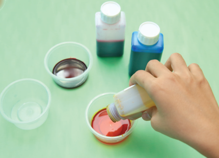 Yang ketiga tuangkan pewarna kain ke dalam bekas/palet. Inisiatif lain adalah boleh juga guna warna poster atau warna air.