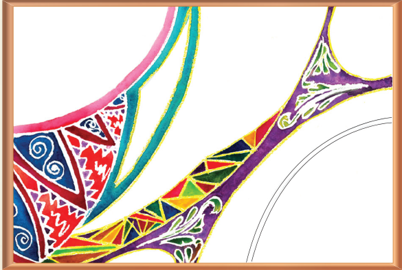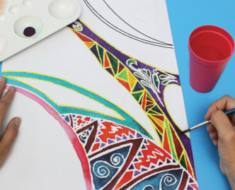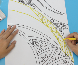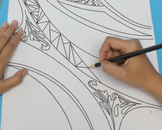Lakarkan corak dengan menggunakan pensil di atas kertas lukisan kemudian terangkan menggunakan marker pen