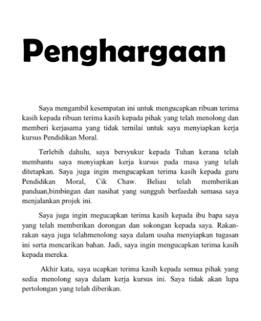 Penghargaan adalah tanda ucapan terima kasih kepada orang yang telah membantu awak dalam menyiapkan folio. Contoh penghargaan awak boleh lihat di bawah.