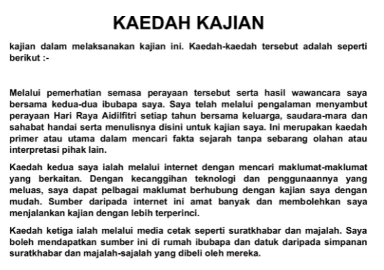 Kaedah kajian adalah apakah cara yang awak gunakan untuk mencari bahan/sumber dalam menyiapkan folio. Kaedah kajian ada banyak seperti kaedah pemerhatian, kaedah temubual, kaedah lawatan ke perpustakaan, kaedah melalui internet, kaedah melalui pembacaan buku dan sebagainya. Contoh cikgu ada sediakan di bawah