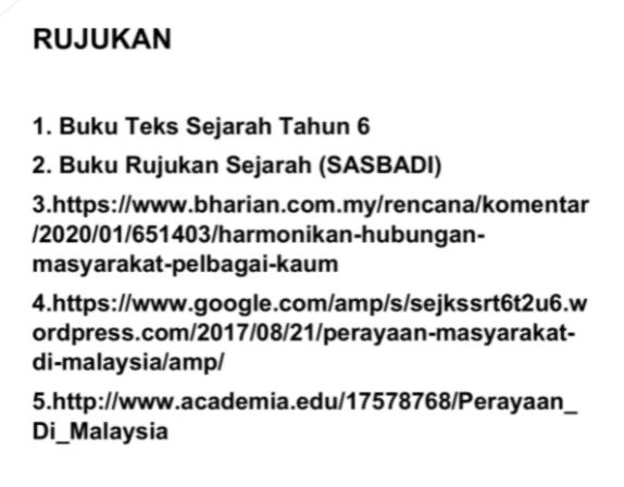 Nyatakan tempat awak mendapat bahan/sumber. Sebagai contoh, kalau awak ambil bahan dari buku,nyatakan nama buku tersebut. Contoh boleh lihat di bawah