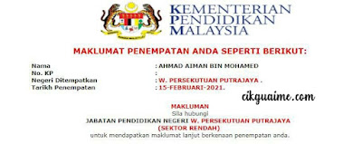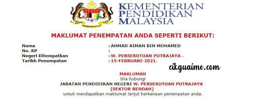 Sebagai contoh, maklumat penempatan negeri pada waktu saya adalah pada 29 Januari 2021. Jadi terimalah dengan hati yang terbuka walau di negeri mana kita ditempatkan. Yang penting kita kena ingat sebab apa kita jadi guru, jangan mudah untuk mengalah, jangan mudah untuk melatah.