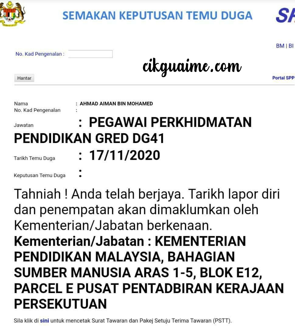 Setelah hampir 8 bulan menganggur di rumah (disebabkan pandemik, kami terpaksa belajar di rumah bermula bulan 3 dan menamatkan pengajian pada bulan 6 2020) akhirnya keputusan yang dinantikan telah tiba iaitu ditawarkan sebagai Pegawai Perkhimatan Pendidikan Gred DG41. Keputusan ini boleh disemak melalu laman web MySPP (kalau tak silap).
