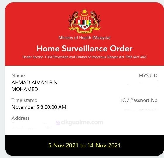 4. Dalam 24 jam, status PROFILE MYSEJAHTERA anda akan berubah, dan anda akan menerima notis HOME SURVEILLANCE ORDER (tarikh kuarantin di rumah).