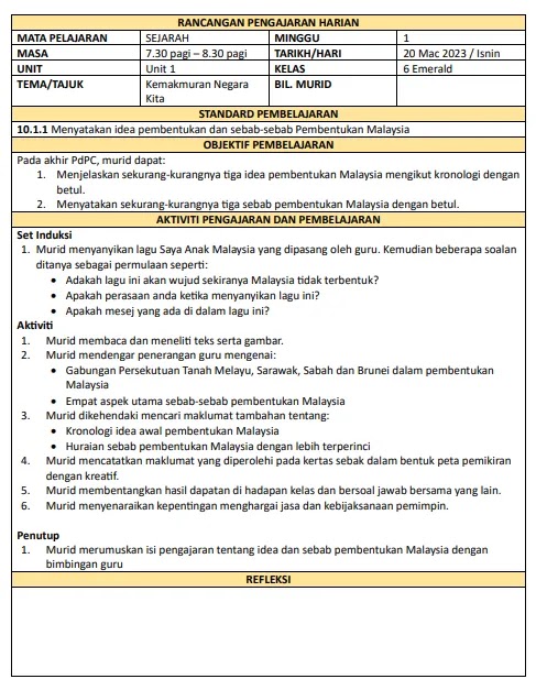 Templat Rancangan Pengajaran Harian (RPH) Versi Ringkas
