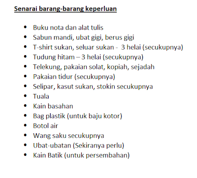 Barang keperluan yang perlu dibawa seperti tertera di bawah:
