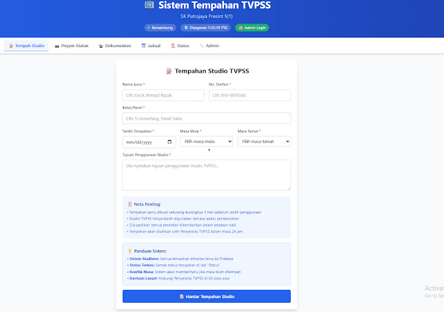 - Pilihan bilik (contoh: “Bilik Mesyuarat / Studio TVPSS / Bilik Khas 1”)